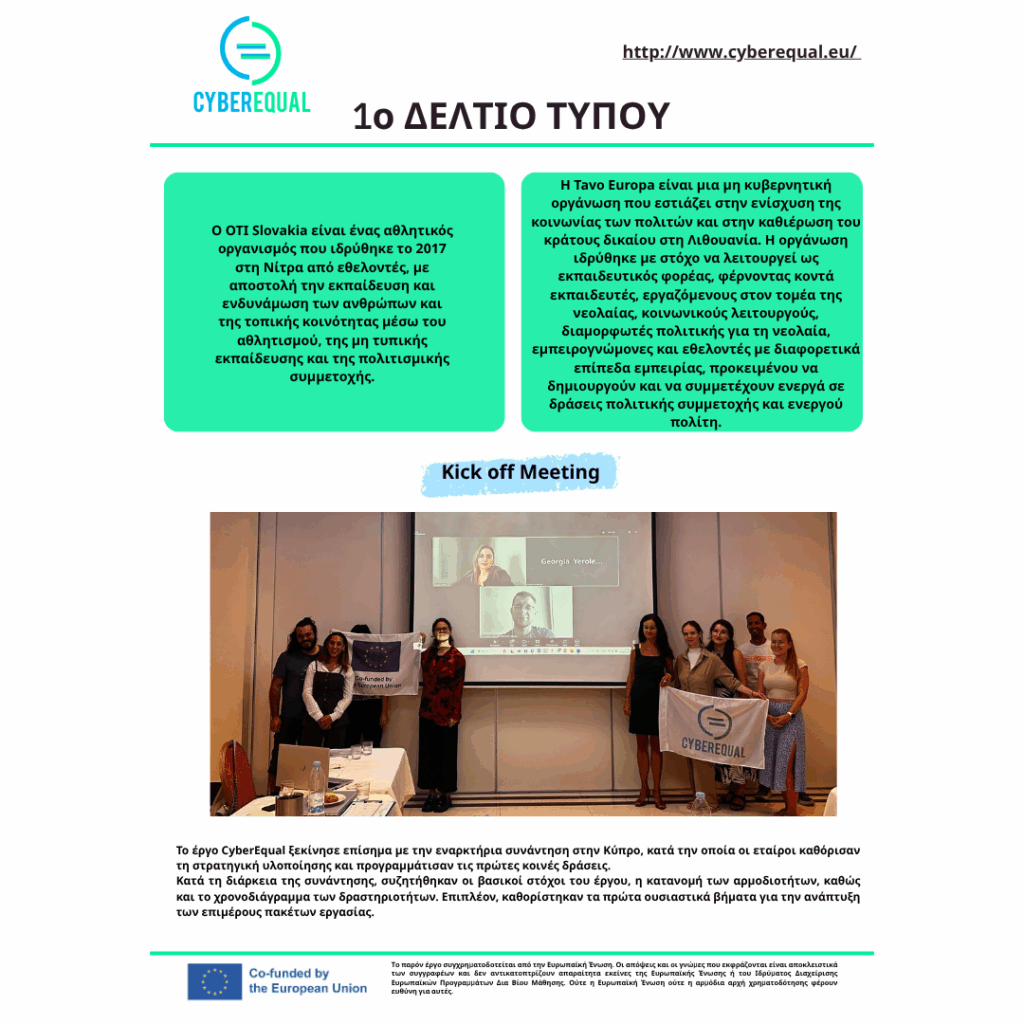 Για περισσότερες πληροφορίες, επισκεφτείτε την ιστοσελίδα του έργου https://www.cyberequal.eu/